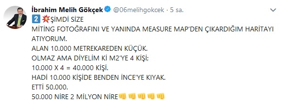 İnce'nin mitinge katılımla ilgili tuhaf ve akıl almaz şekilde abartılı rakam vermesine karşılık, o meydanı çok iyi bilen Melih Gökçek de yaptığı hesapla, meydan ve caddelerdeki insan sayısının en fazla 50 bin olduğunu belirtti.