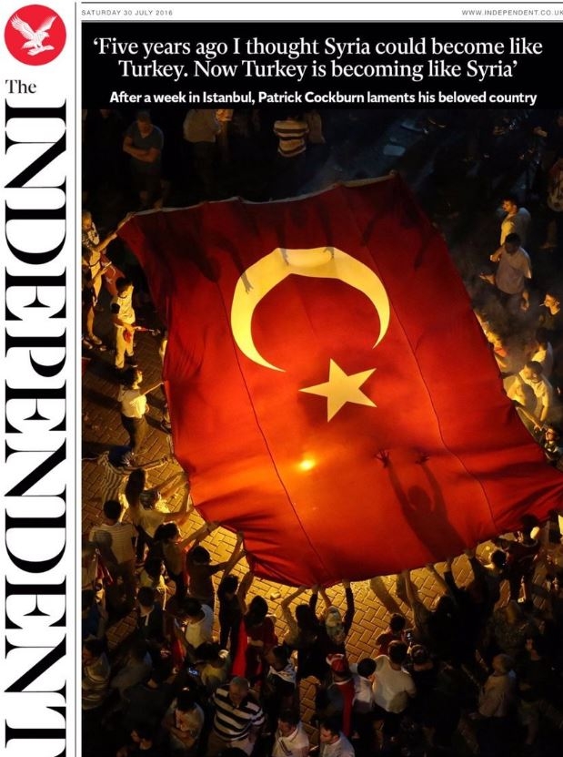 Bugünkü manşetinde muhabiri Patrick Cockburn “5 yıl önce Suriye Türkiye'ye benzeyebilir diye düşünüyordum. Şimdi ise Türkiye Suriye gibi oluyor" şeklindeki düşüncelerini manşete taşıyan Independent, Türkiye'de karışıklık varmış algısı yaratma çabalarını sürdürüyor.