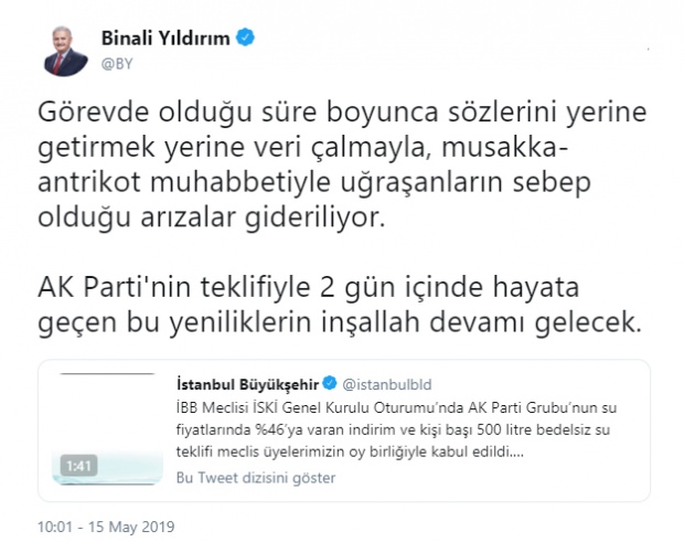 Cumhur İttifakı'nın İstanbul Büyükşehir adayı Binali Yıldırım, İBB Meclisi'nde kabul edilen su faturasına yüzde 46 indirim getiren karar sonrası kişisel Twitter hesabından bir değerlendirmede bulundu.