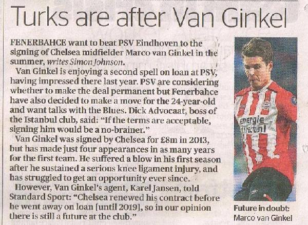 Van Ginkel, 2013 yılında 8 milyon sterline PSV'ye transfer oldu ancak diz liflerinden sakatlanmasıyla 4 maçta oynayabildi. Geçen sezon formunu bulan yıldız futbolcunun menaceri Karel Jansen "Chelsea kontratını 2019 yılına kadar kontratını yeniledi ve hala Chelsea'de geleceği var" dedi.