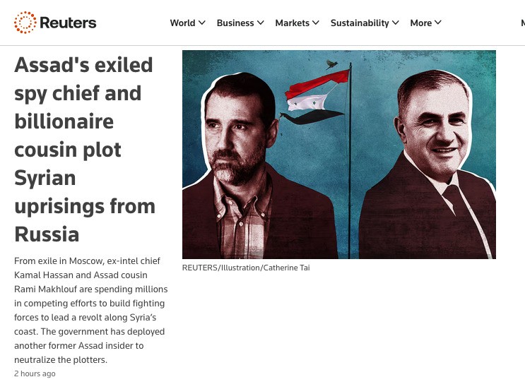 Moskova’daki sürgünlerinden Hasan ve Mahluf, parçalanmış bir Suriye öngörüyor ve her ikisi de Alevilerin çoğunlukta olduğu bölgelerin kontrolünü istiyor. Reuters, her ikisinin de güç oluşturmak için milyonlarca dolar harcadığını ortaya koydu. Yardımcıları Rusya, Lübnan ve Birleşik Arap Emirlikleri’nde bulunuyor.