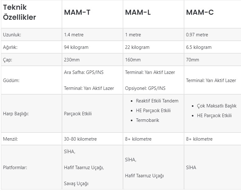 Roketsan’ın mini akıllı mühimmat ailesinin en yeni üyesi olan MAM-T, aynı zamanda ‘en irisi’ konumunda bulunuyor. TEBER Lazer Güdüm Kiti’nden elde edilen tecrübelerle geliştirilen MAM-T; 230 milimetre çapa, 1.4 metre uzunluğa, 94 kilogram ağırlığa, parçacık etkili harp başlığına, ara safha güdüm için GPS/INS’e ve terminal safha güdüm için ise yarı aktif bir lazer arayıcı başlığa sahiptir.
