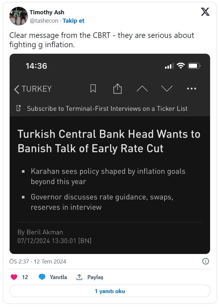 Ünlü ekonomist Ash, Merkez Bankası Başkanı Fatih Karahan'ın Bloomberg röportajına da şu yorumu yaptı: