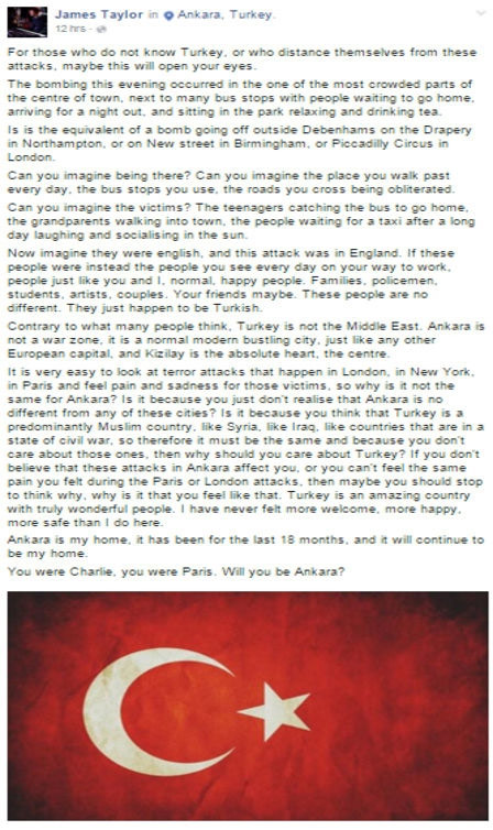 James Taylor isimli sosyal medya kullanıcısının Ankara'da dün gerçekleştirilen saldırı ile ilgili Facebook postu dünya çapında ses getirdi.