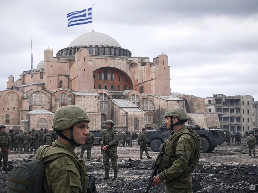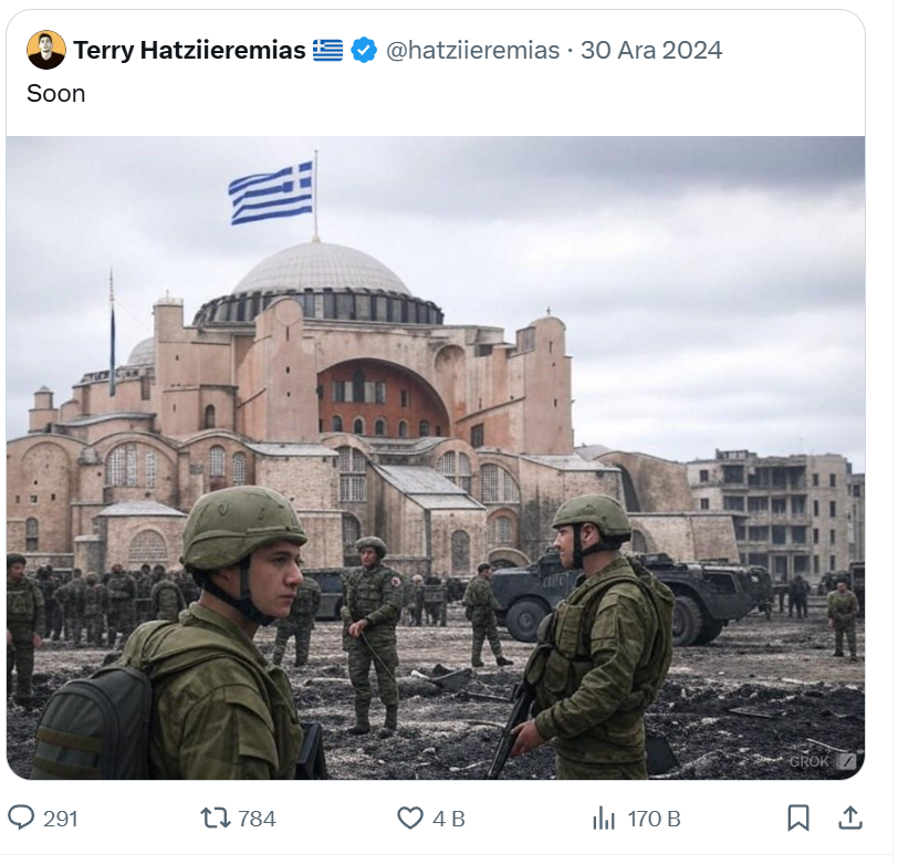Golding, üzerinde Yunanistan bayrağının yer aldığı ve çevresinde de askerlerin bulunduğu Ayasofya görseli paylaştı. İngiliz lider, paylaşımına, "Yakında" notunu düştü.