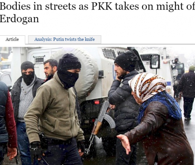 "PKK'nın ölü bedenlerinin olması Erdoğan'ın yüzünden" manşetiyle okuyuculara duyurulan haberde, sivillerin çapraz ateşte olduğu iddia edilerek Türkiye açıkca suçlandı.