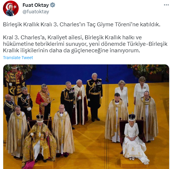 Kral 3. Charles'ın taç giyme törenine Türkiye'yi temsilen Cumhurbaşkanı Yardımcısı Fuat Oktay katıldı.