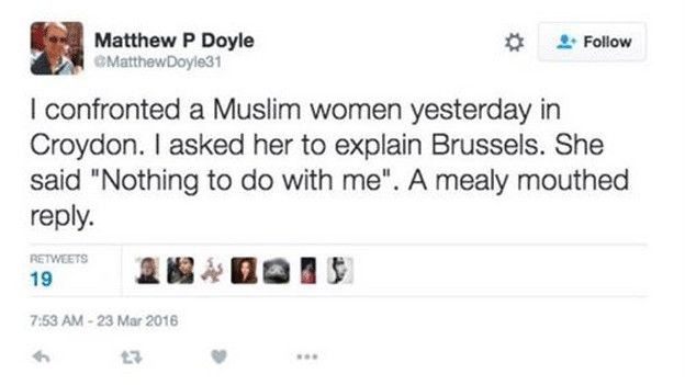 İngiltere'de yaşayan Matthew Doyle dün Twitter'den yayınladığı mesajda "Dün Croydon'da Müslüman bir kadından Brüksel'i açıklamasını istedim. 'Benimle ilgisi yok' dedi. Yan çizen, samimiyetsiz bir yanıt" demişti.