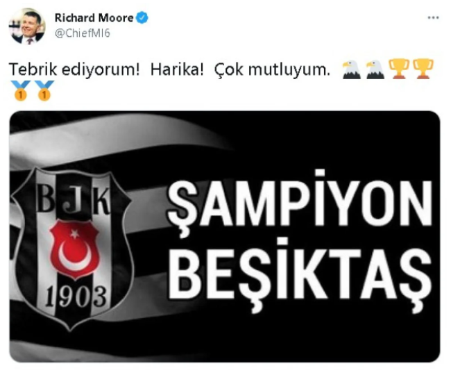 İngiltere'nin eski Türkiye büyükelçisi Richard Moore, Süper Ligi şampiyon olarak tamamlayan Beşiktaş'ı tebrik etti.
