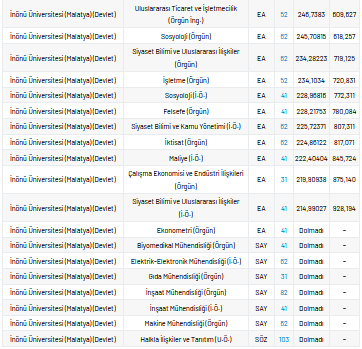 İnönü Üniversitesi 2021 taban puanları ve yüzdelik dilimleri