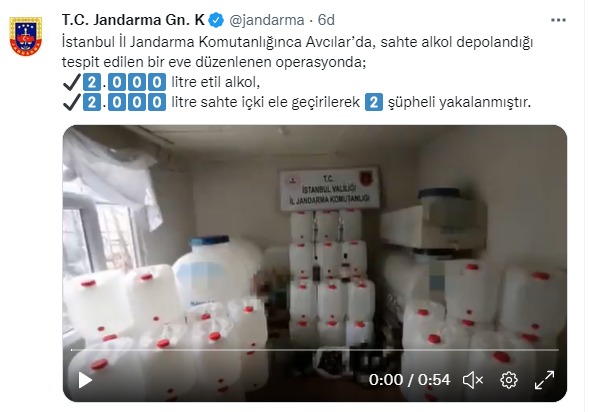 Jandarma Genel Komutanlığı, sosyal medya hesabı üzerinden yaptığı paylaşımda sahte içki yapan 2 kişiyi yakaladığını duyurdu. Yapılan paylaşımda, “İstanbul İl Jandarma Komutanlığınca Avcılar’da, sahte alkol depolandığı tespit edilen bir eve düzenlenen operasyonda; 2 bin litre etil alkol, 2 bin litre sahte içki ele geçirilerek 2 şüpheli yakalanmıştır” ifadeleri kullanıldı.