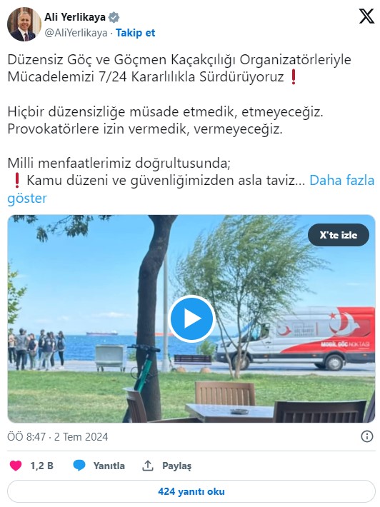 Yerlikaya, provokatörlere izin vermeyeceklerini söyleyerek, "Milli menfaatlerimiz doğrultusunda; kamu düzeni ve güvenliğimizden asla taviz vermeden, insan haklarına, hukuka, medeniyet değerlerimize uygun olarak göç ile aralıksız mücadele ediyoruz ve etmeye de devam edeceğiz" dedi.