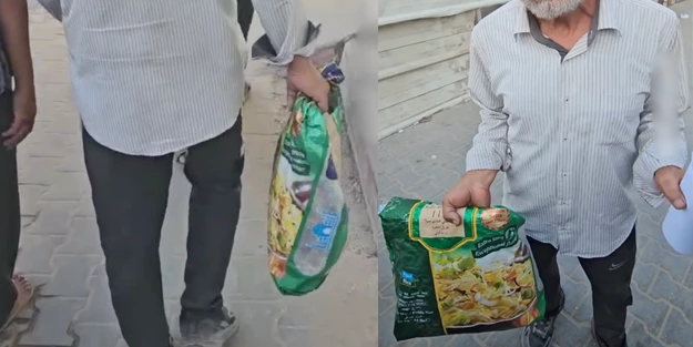İnsanlığı yerin dibine batıran görüntüler: Gazzeli dede, torunun naaşını 3 kiloluk pirinç paketine koydu