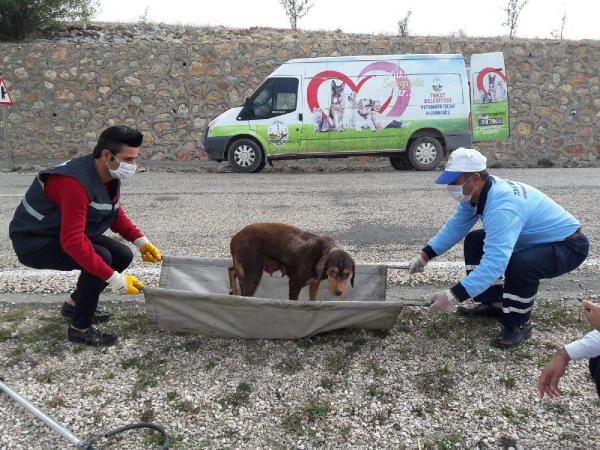 Tokat'ta, otomobille giderken yola aniden çıkan köpeğe çarpıp, yaralanmasına neden olan Sedat Sevil, belediye görevlileri gelene kadar hayvanın başında bekledi. Sevil, önüne ekmek parçaları koyduğu köpeğe, şişeyle su içirmeye çalıştı.