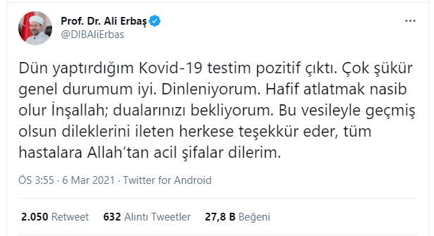 Diyanet İşleri Başkanı Ali Erbaş, dün twitter hesabından yaptığı paylaşımla koronavirüse yakalandığını söyleyerek, Müslümanlardan dua istemişti.