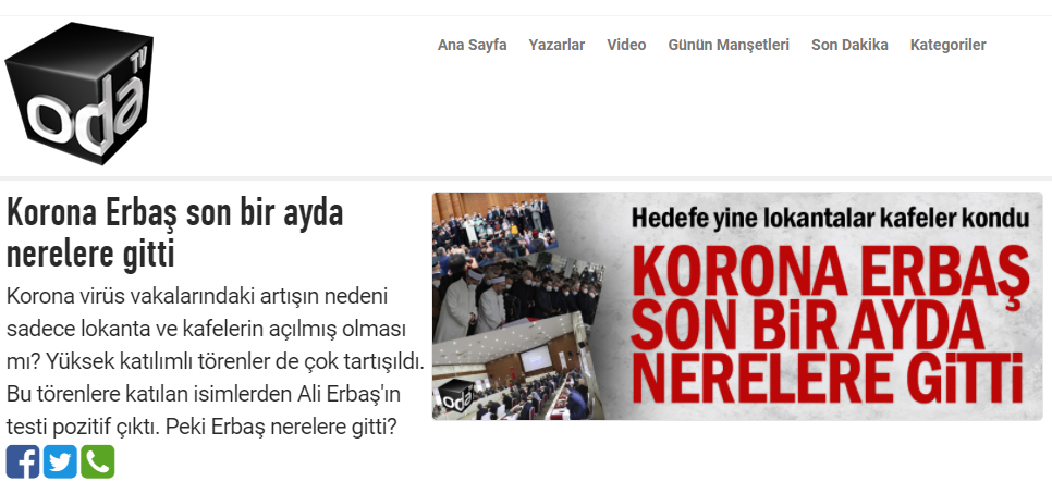 Akıllara durgunluk veren ifadenin yer aldığı haberde, Diyanet İşleri Başkanı Ali Erbaş ile birlikte AK Parti iktidarı da hedef alındı. Pandemiyi hiçe sayarak sokaklarda baş gösteren azgınların eylemini 'hak arama' olarak haberleştiren Oda Tv, devlet yetkililerini salgın tedbirlerine riayet etmemekle suçladı.