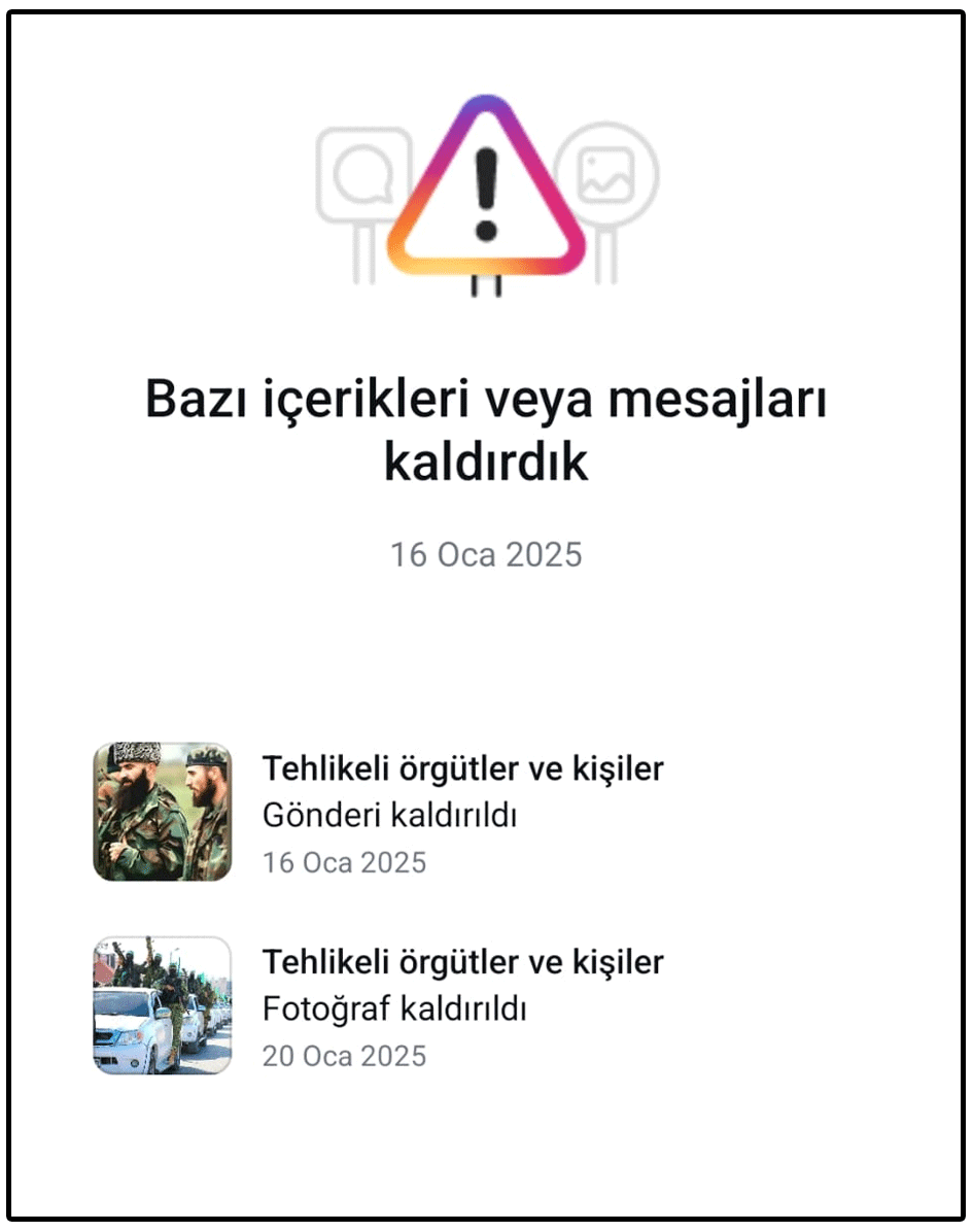 Gazetemizin eski dağıtım müdürü ve emektarlarından Ülkü Kumral’ın 16 Ocak tarihinde paylaştığı Çeçen savaşının efsane komutanlarından Şamil Basayev’i ve 20 Ocak tarihinde paylaştığı Siyonist İsrail’e karşı direnen Gazzeli mücahitlerin görselleri paylaşımını 'tehlikeli örgütler ve kişiler ' kategorisine alarak kaldırdı.
