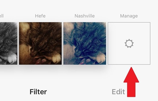Instagram’ı açıp fotoğrafınızı çekin ve ekranın alt kısmındaki filtreleri sağa doğru bitinceye kadar sürükleyin. En sonda Yönet isimli butonu gördüğünüzde ona basın.