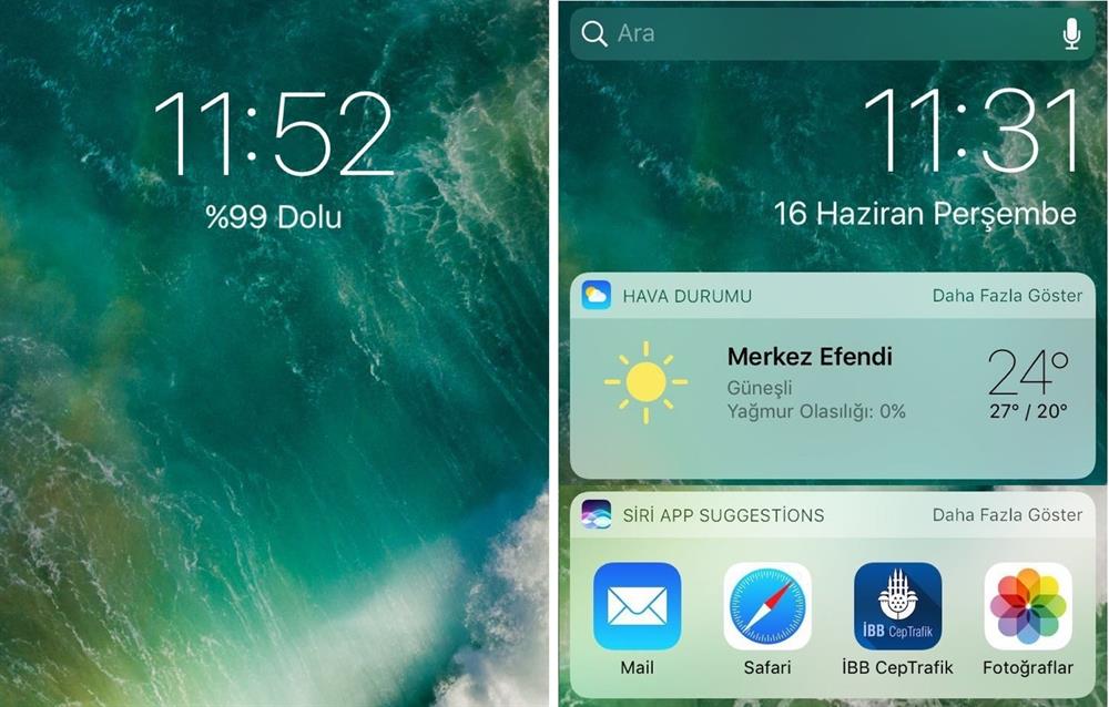 iOS 10'da en büyük değişimlerden bir tanesi de kilit ekranında oldu. Artık kilit ekranını sola kaydırdığımızda hava durumu, favori aramalar ve mail gibi istediğimiz öğeleri görebiliyor ve kolayca erişebiliyoruz. Ekranı sağa kaydırdığımızda ise kamera açılıyor.