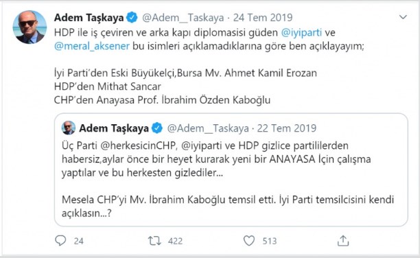 İYİ Parti’nin yakın dönemdeki eylemlerine ve açıklamalarına rağmen, HDP ile kurdukları ortaklığı inkâr etmelerinin aldatmaca olduğu bir kez daha gözler önüne serildi. Dün Didem Arslan Yılmaz’ın konuğu olan Vatan Partisi Genel Başkanı Doğu Perinçek, CHP- İYİ Parti(İP), HDP ve Sadet Partisi’nin(SP) 2018 Ocak ayında birlikte kurduğu “yeni anayasa komisyonuyla” ilgili açıklamalar yaptı. Perinçek, komisyonunun eski İYİ Parti Medya ve Propaganda Başkan Yardımcısı Adem Taşkaya tarafından kamuoyuna duyurulduğunu belirtti.