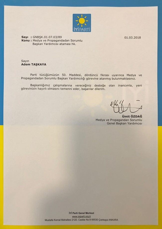 Programın diğer konuğu İYİ Parti Genel Başkan Yardımcısı ve Milletvekili Ümit Dikbayır, önce HDP ile kurdukları yeni anayasa komisyonunu reddetti, bunun bir iftira olduğunu söyledi. Dikbayır ardından, Adem Taşkaya için “Partimizde böyle bir yöneticimiz yok” dedi. Bunun üzerine Doğu Perinçek, Adem Taşkaya’nın 1 Mart 2018 tarihinde İYİ Parti’de söz konusu göreve atandığını gösteren, Ümit Özdağ imzalı atama belgesini ekrandan paylaştı. Özdağ o dönemde Medya ve Propagandadan sorumlu Genel Başkan Yardımcısıydı. İmzalı belge, Dikbayır’ın partisi hakkında gerçekleri söylemediğini ortaya çıkardı.