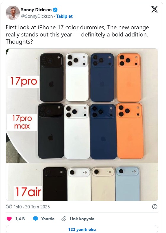iPhone 17 Air tarafında ise siyah, beyaz, altın ve açık mavi renkler öne çıkıyor. Bu dört renk daha önce model için iddia edilen renklerle büyük oranda örtüşüyor