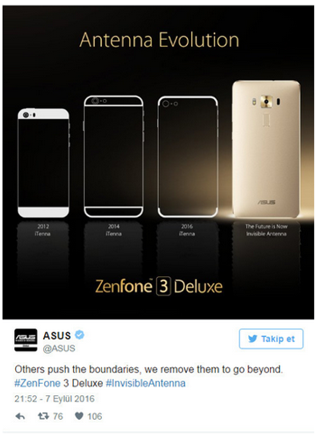 ASUS, ZenFone 3'ün anten çizgilerinin tamamen görünmez olduğunu açıkladıktan sonra her sene anten çizgilerini inceltmekle övünen Apple için resmi Twitter adresinden şu tweet'i paylaştı: