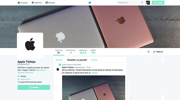 Webtekno sitesinde yer alan habere göre masum ve bilinçsiz kesimin hayallerini süsleyecek iPhone 7 ve birçok Apple ürününü hediye edeceğini iddia eden ve bunun üzerinden prim yaparak ilerde kullanıcı adı değiştirilip satılacak bir profil türedi. Twitter üzerinden @Applelphone7 şeklinde ulaşabileceğiniz sahte hesap, bir de Apple Türkiye ismini kullanıyor. “Etkinlikler ve çekiliş sonuçları için takipte kalın. Hergün 7 Etkinlik.” şeklinde bir de açıklama girmiş olan bu profil, her gün iPhone 7, MacBook, iPhone 6S, iPad gibi ürünleri RT eden 5 kişiye vereceğine dair saçma vaatler sunarak kullanıcıları kandırmakta.