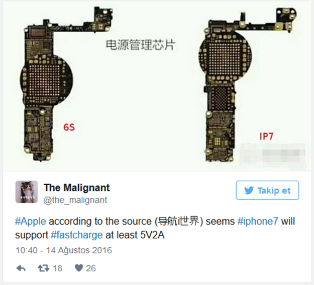 Kendisinin attığı bu tweet'e göre Apple 5V2A'lık hızlı şarj özelliğini kullanacak. Attığı iki farklı devre ile aradaki farklı da göstermiş. Eğer bu görseller doğruysa şarj konusunda kullanıcılar tarafından eleştirilen iPhone akıllı telefonlar en azından kısa süreler içerisinde bataryalarını doldurabilecekler.