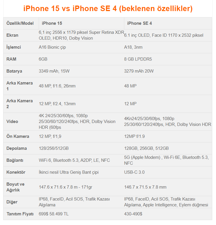 Apple, 2025 yılında uygun fiyatlı iPhone SE 4 modelini piyasaya sürmeyi planlıyor. iPhone SE 4, iPhone 15’e kıyasla bazı önemli özellikler sunması bekleniyor. İşte beklenen özellikler: