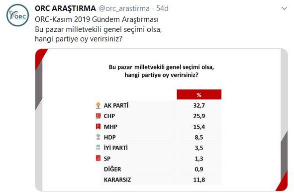 ORC'nin Kasım 2019 anketinde ise İYİ Parti'nin oyu yüzde 3,5'lerde görülüyordu.
