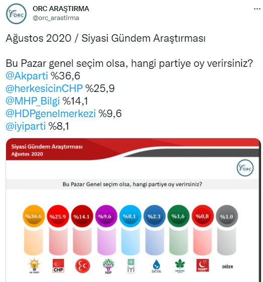 ORC'nin yayınladığı aynı anketlere göre, İYİ Parti'nin oy oranı 2020 yılının Ağustos ayına göre yüzde 8,1 gösterildi.