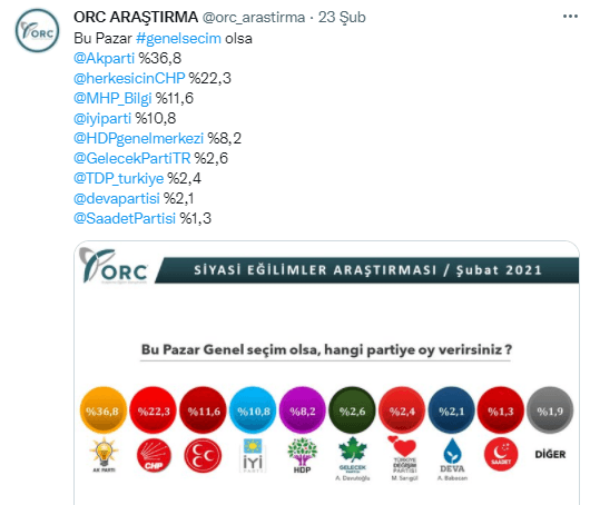 ORC'nin yayınladığı 2021 yılının Şubat ayındaki anketine göre, İYİ Parti'nin oy oranı yüzde 10,8 olarak gösterildi.