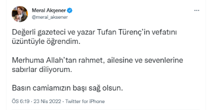 İYİ Parti Genel Başkanı Meral Akşener, başörtüsüne yönelik nefreti ile hafızalara kazınan Tufan Türenç için rahmet diledi.