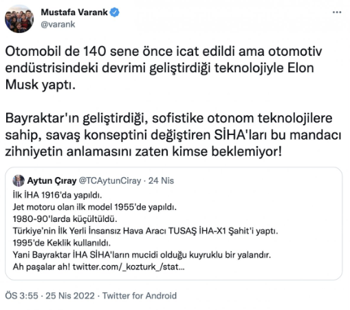 Çıray'ın yorumunu 'Mandacı zihniyet' olarak eleştiren Bakan Varank, "Otomobil de 140 sene önce icat edildi ama otomotiv endüstrisindeki devrimi geliştirdiği teknolojiyle Elon Musk yaptı. Bayraktar'ın geliştirdiği, sofistike otonom teknolojilere sahip, savaş konseptini değiştiren SİHA'ları bu mandacı zihniyetin anlamasını zaten kimse beklemiyor!" dedi.