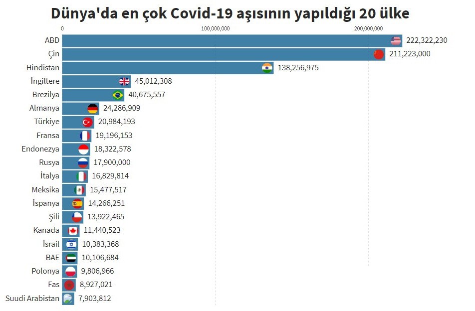 Dünyada en çok Covid-19 aşısının yapıldığı 20 ülkenin gösterildiği istatistikte Türkiye; İtalya, İspanya ve Fransa gibi birçok Avrupa ülkesini geride bırakarak 7. sırada yer aldı. Türkiye'de bugüne kadar 20 milyon 984 bin 193 doz Kovid-19 aşısı yapıldı.