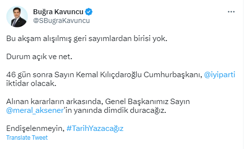 Bu akşam alışılmış geri sayımlardan birisi yok. Durum açık ve net. 46 gün sonra Sayın Kemal Kılıçdaroğlu Cumhurbaşkanı, İYİ Parti iktidar olacak. Alınan kararların arkasında, Genel Başkanımız Sayın Meral Akşener'in yanında dimdik duracağız. Endişelenmeyin, tarih yazacağız.