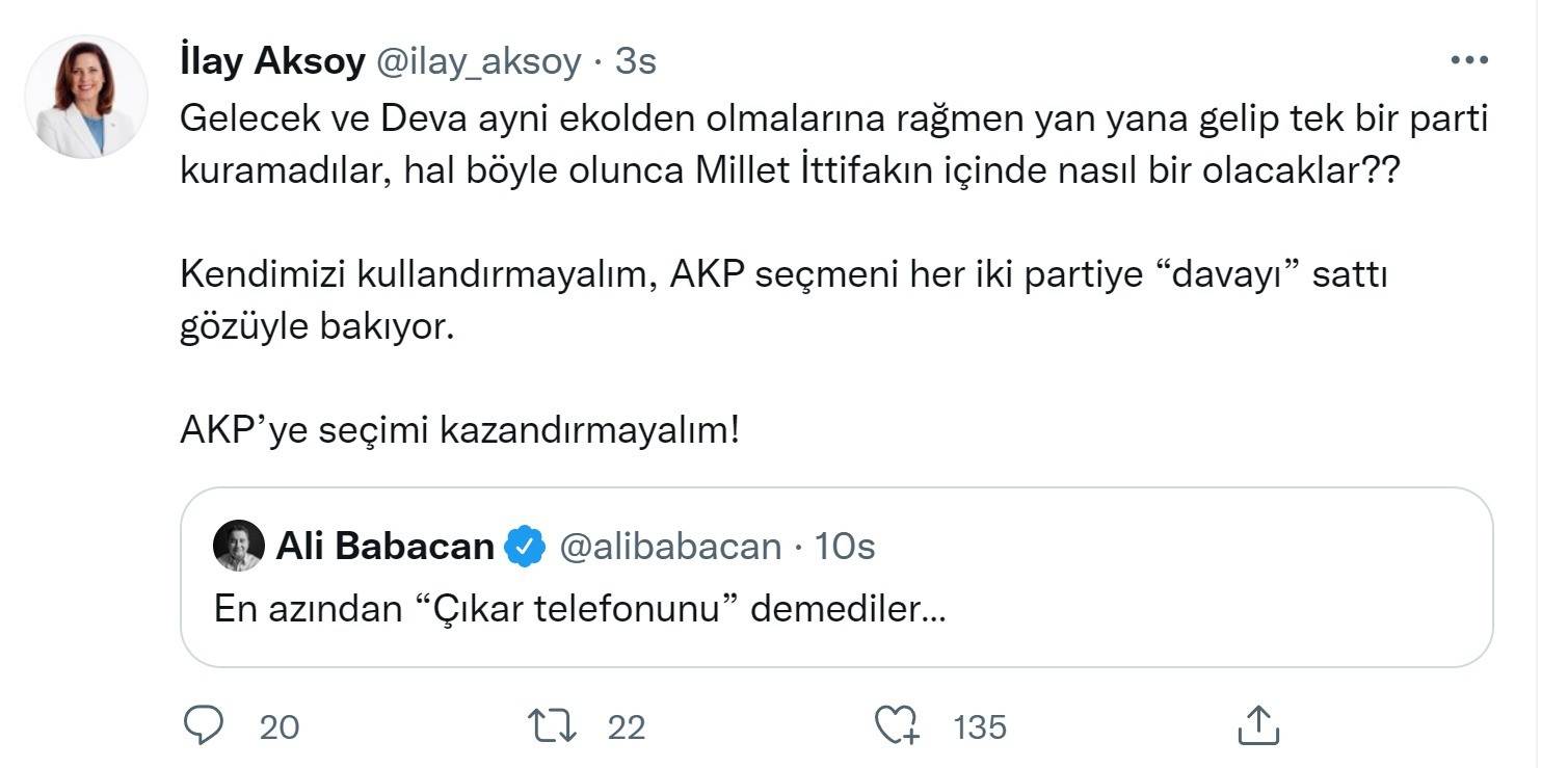 İYİ Parti Kurucular Kurulu Üyesi İlay Aksoy'un attığı bir tweet Millet İttifakı'ndan depreme neden oldu. Millet İttifakı'na yeni partilerin alınacağı iddiasının konuşulduğu bugünlerde İP'li Aksoy, adeta Ahmet Davutoğlu'nun Gelecek Partisi'ne ve Ali Babacan'ın Deva Partisi'ne kapıların kapanması gerektiğini söyledi.