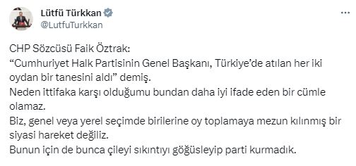 İYİ Parti'nin küfürbaz milletvekili Lütfü Türkkan, CHP Sözcüsü Faik Öztrak'ın seçim hezimetinden sonra yaptığı, "Cumhuriyet Halk Partisinin Genel Başkanı, Türkiye'de atılan her iki oydan bir tanesini aldı." açıklamasını hedef aldı.