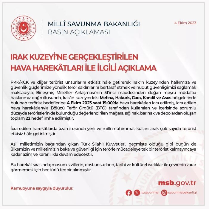 Açıklamada, PKK/KCK ve diğer terörist unsurları etkisiz hale getirerek Irak'ın kuzeyinden halka ve güvenlik güçlerine yönelik terör saldırılarını bertaraf etmek ve hudut güvenliğini sağlamak amacıyla Birleşmiş Milletler Anlaşması'nın 51'inci maddesinden doğan meşru müdafaa hakları doğrultusunda, Irak'ın kuzeyindeki Metina, Hakurk, Gara, Kandil ve Asos bölgelerinde bulunan terörist hedeflerine bugün saat 19.00'da hava harekatı gerçekleştirildiği aktarıldı.