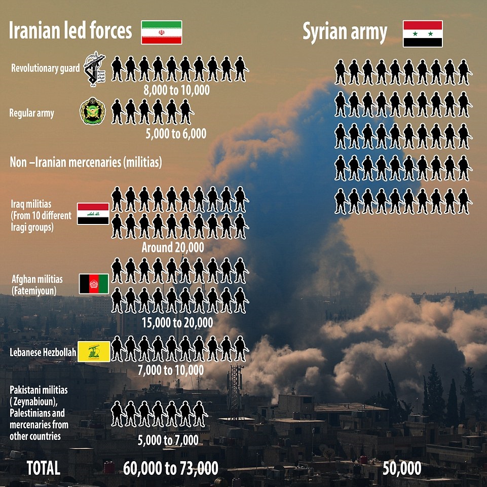 Suriye iç savaşını fırsat olarak kullanan İran ve Şii milisler Suriye topraklarında ordulaşmaya başladı. İngiliz basınında yer alan bir rapora göre, Suriye'deki İran ve Şii milislerinin sayısı 60 bini bulurken, bu rakam 50 bin kişilik orduya sahip olduğu bilinen Esed'in ordu güçlerinin sayısını aştı.