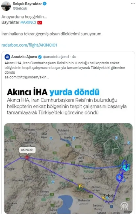 Baykar Yönetim Kurulu Başkanı / Teknoloji Lideri (CTO) Selçuk Bayraktar, İran Cumhurbaşkanı İbrahim Reisi'nin öldüğü helikopterin enkazını bulan ve yurda dönen Akıncı İHA ile ilgili paylaşım yaptı.