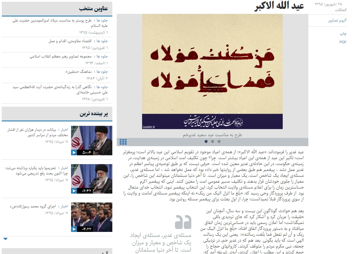 Hamaney'in resmi sayfasında "Kadir-i Hum İslam dininin en büyük bayramıdır" yazısı;