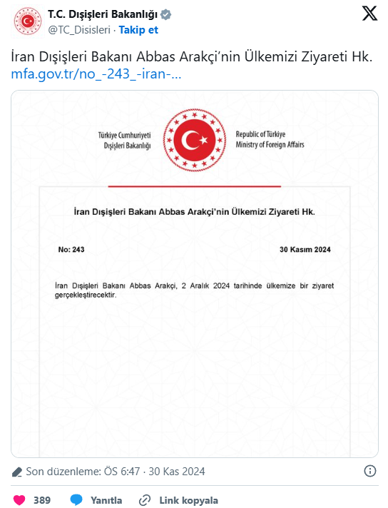 Dışişleri Bakanlığı'ndan yapılan açıklamada, İran Dışişleri Bakanı Abbas Irakçi'nin 2 Aralık Pazartesi günü Türkiye'ye bir ziyaret gerçekleştireceği belirtildi.