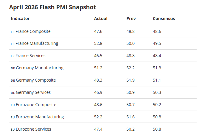 Öncü Euro Bölgesi Bileşik PMI'ı marttaki 50,7'den nisanda 48,6'ya gerileyerek büyüme ile daralma arasındaki eşiği gösteren 50 puanın oldukça altına indi. Bu, yaklaşık bir buçuk yılın en düşük seviyesi.