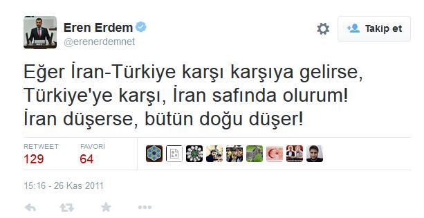 "İran-Türkiye karşı karşıya gelirse, Türkiye'ye karşı, İran safında olurum! İran düşerse, bütün doğu düşer!" diyen CHP Parti Meclisi Üyesi Eren Erdem, Irak'ta ABD tarafından öldürülen İranlı komutanlar konusunda akşam saatleri itibarıyla sessiz kaldı.
