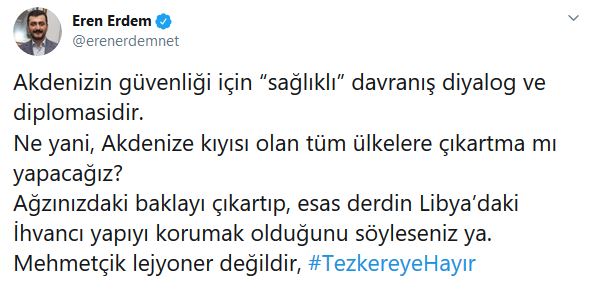 Bu arada aynı Eren Erdem, Türkiye'nin Libya'ya askeri eğitim amaçlı birlik göndermesine ilişkin dün tezkerenin oylanmasıyla ilgili sosyal medya hesabından "Akdeniz'in güvenliği için 'sağlıklı' davranış diyalog ve diplomasidir. Ne yani, Akdeniz'e kıyısı olan tüm ülkelere çıkartma mı yapacağız? Ağzınızdaki baklayı çıkartıp, esas derdin Libya’daki İhvancı yapıyı korumak olduğunu söyleseniz ya. Mehmetçik lejyoner değildir." açıklaması yaptı. Erdem "tezkereye hayır" 'hashtag'ini kullandı.