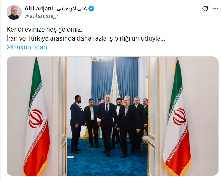 Tahran ziyareti kapsamında sırasıyla mevkidaşı Abbas Erakçı, Meclis Başkanı Muhammed Bakır Kalibaf ve Cumhurbaşkanı Mesud Pezeşkiyan'la görüşen Dışişleri Bakanı Hakan Fidan, son olarak İran Ulusal Güvenlik Yüksek Konseyi Genel Sekreteri Ali Laricani ile bir araya gelerek bölgesel güvenlik konularını görüştü. Laricani, ziyarete ilişkin X sosyal medya platformundaki hesabından yaptığı Türkçe paylaşımda, "Kendi evinize hoş geldiniz. İran ve Türkiye arasında daha fazla iş birliği umuduyla" ifadelerini kullandı.