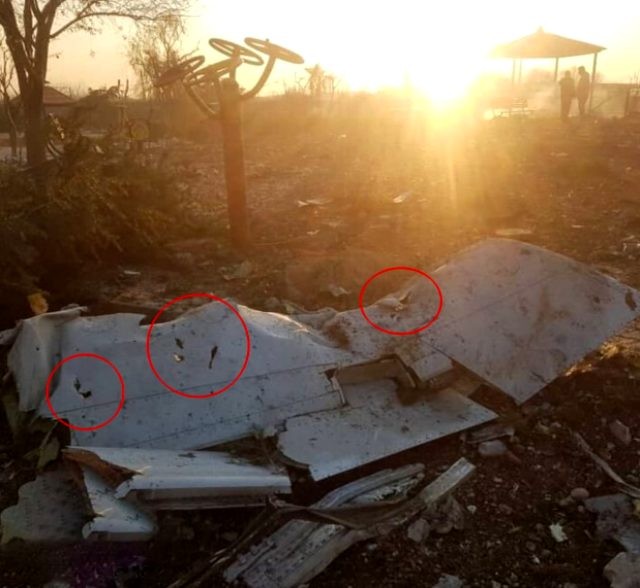 176 kişinin hayatını kaybettiği kazada, uçağın enkazına ait parçalarda mermi deliklerine benzeyen hasarlar gözlendi. Reuters'in servis ettiği görüntülerde düşen uçağa ait enkaz parçalarında saldırı olduğunu düşündürecek delikler ve hasarlar olduğu gözlemlendi.