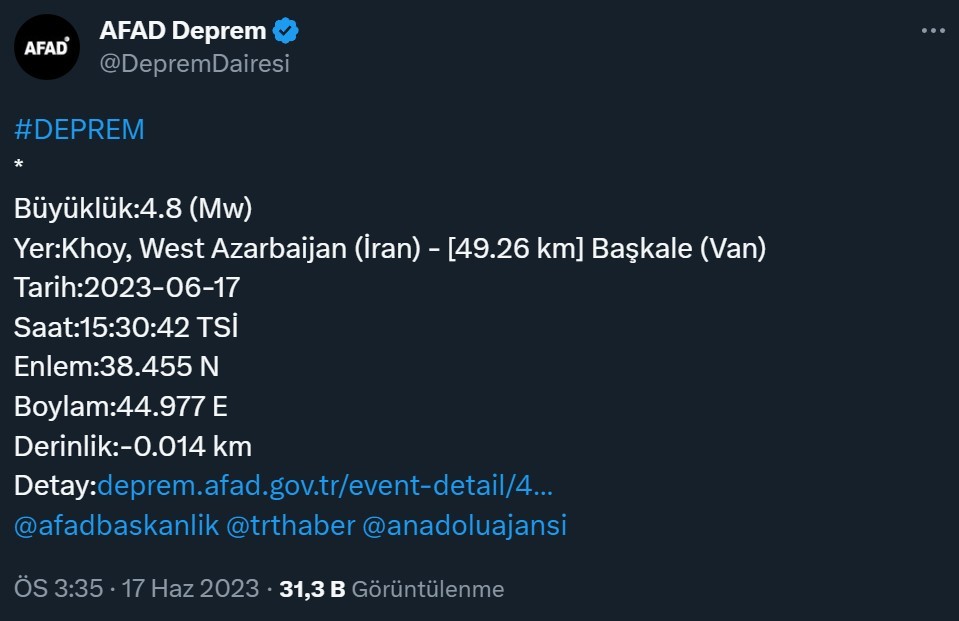 İçişleri Bakanlığı Afet ve Acil Durum Yönetimi Başkanlığı (AFAD), Khoy merkezli Batı İran'da 4.8 büyüklüğünde bir deprem meydana geldiğini açıkladı.